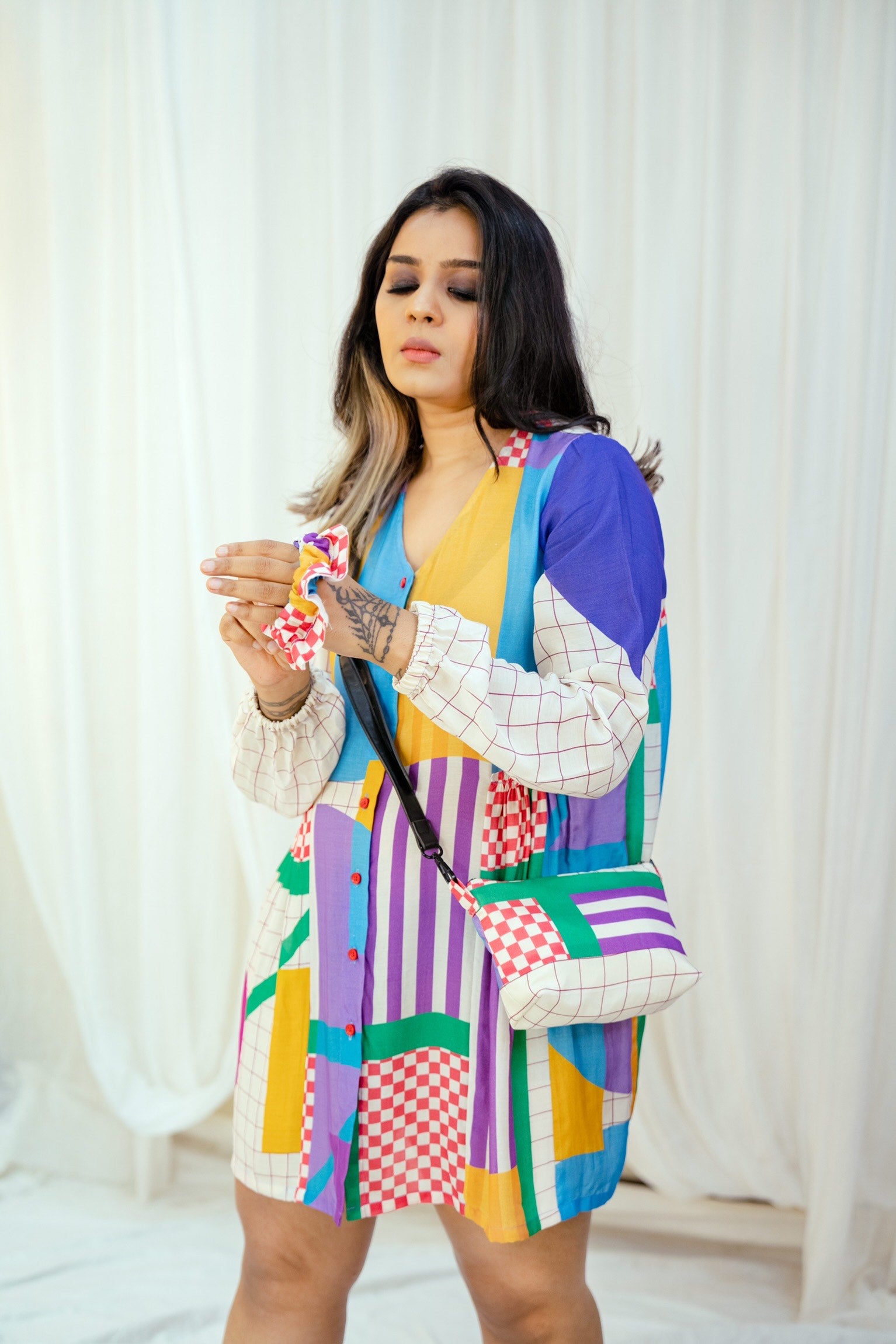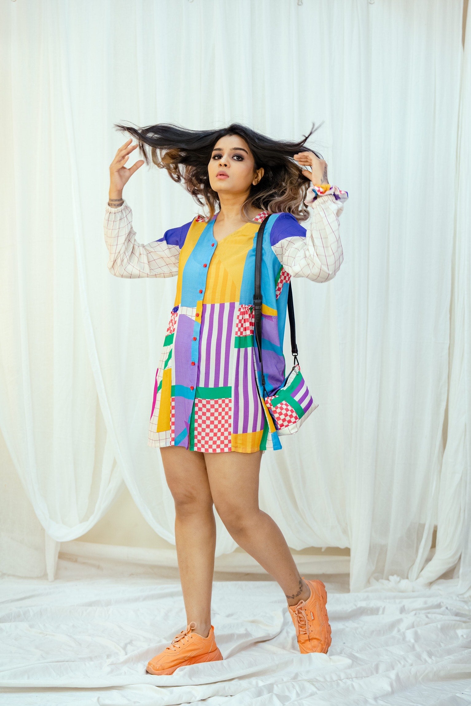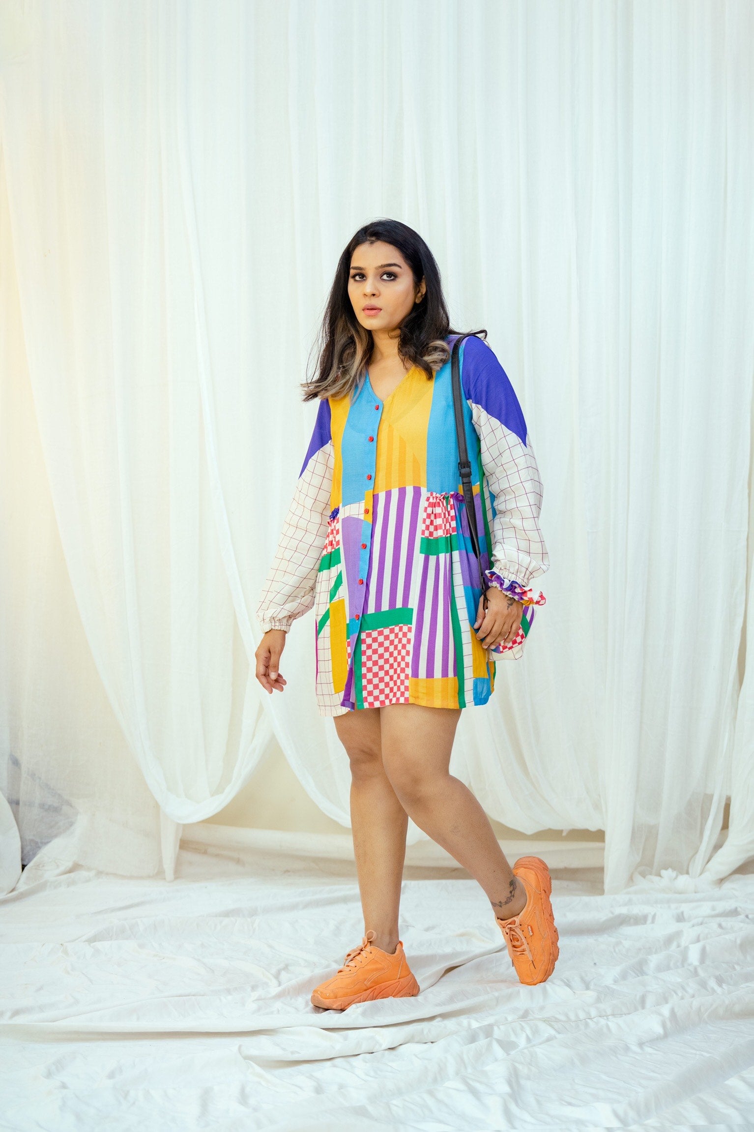It's a colorful panel print shirt dress, with gathering detail at side waist. The sleeves will be fitted at wrist and loose from arms. Super cozy, comfortable and quirky.