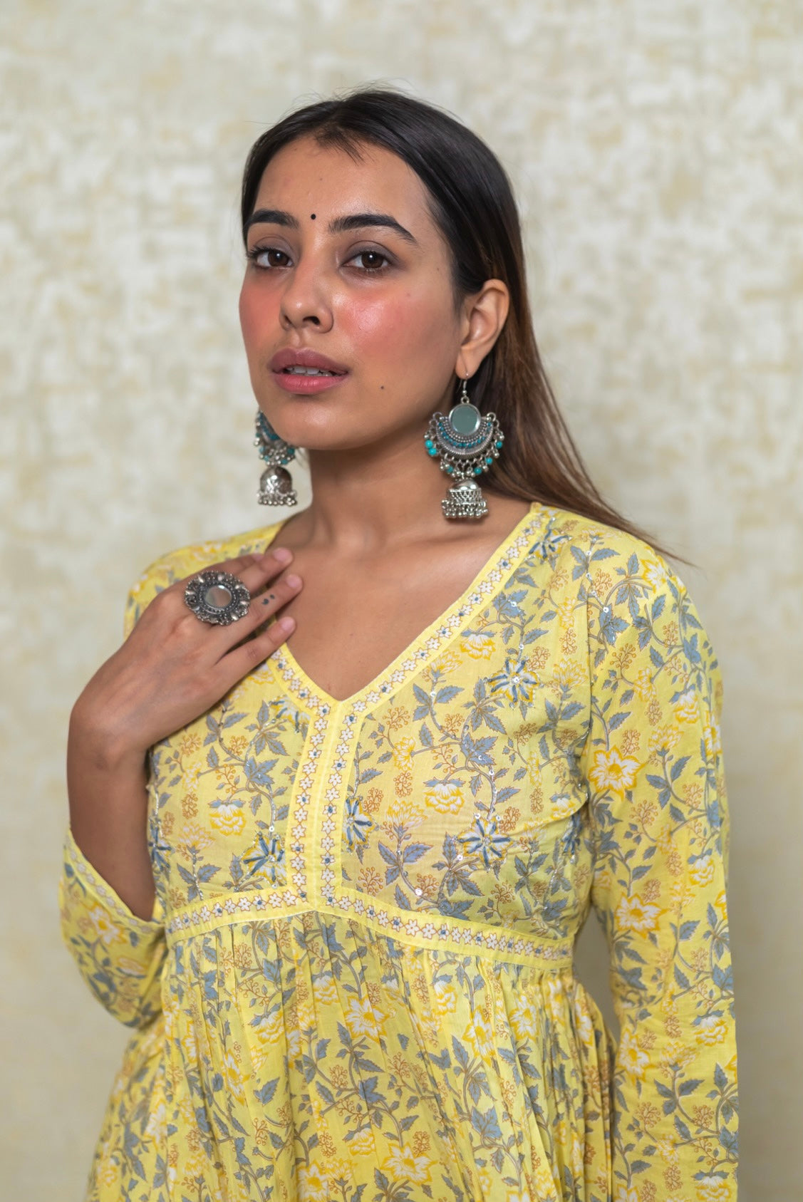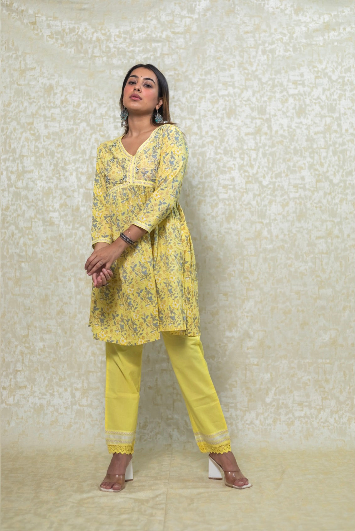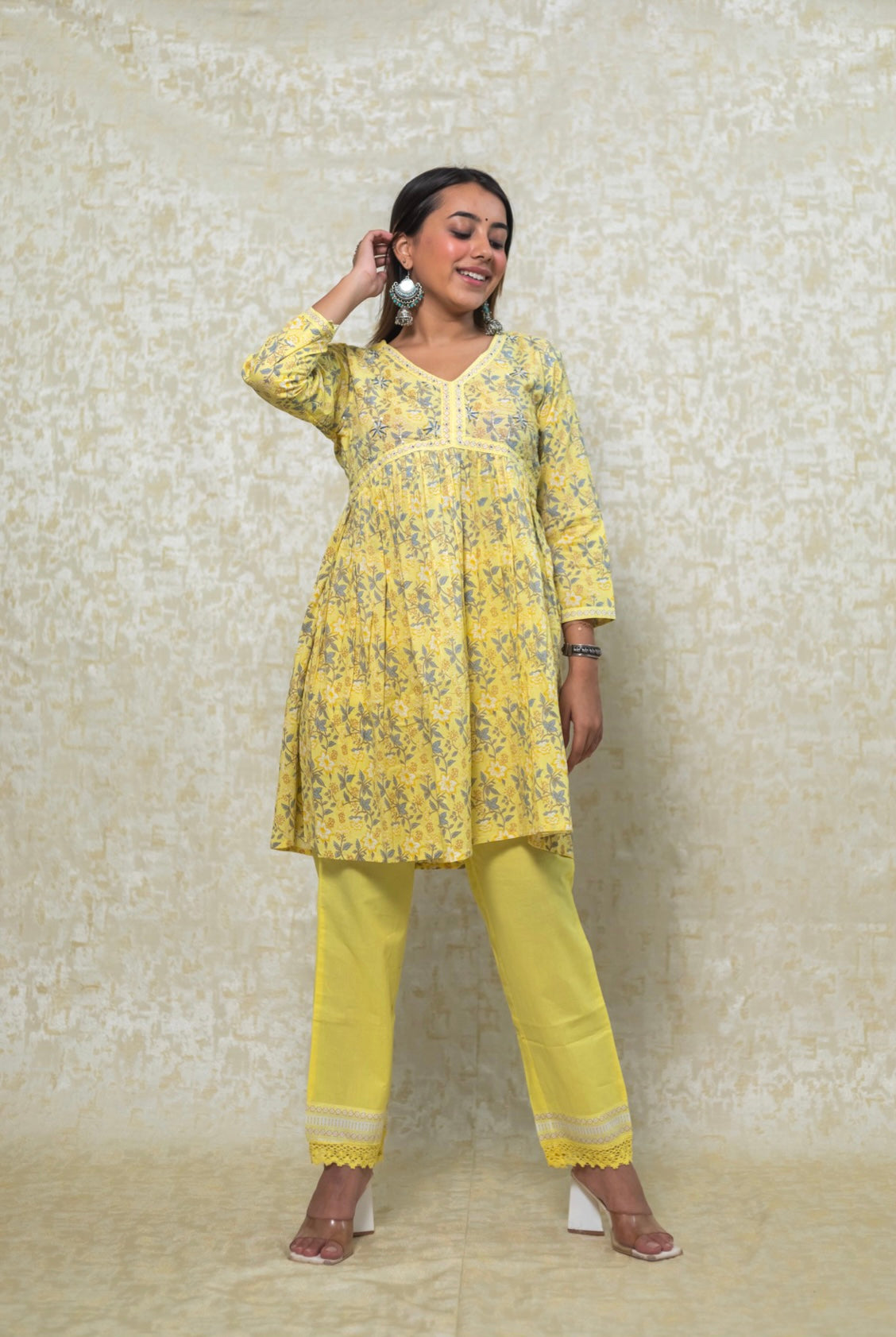 Printed yellow peplum pant set with the famous alia cut, the peplum has handwork and pant has cotton lace details