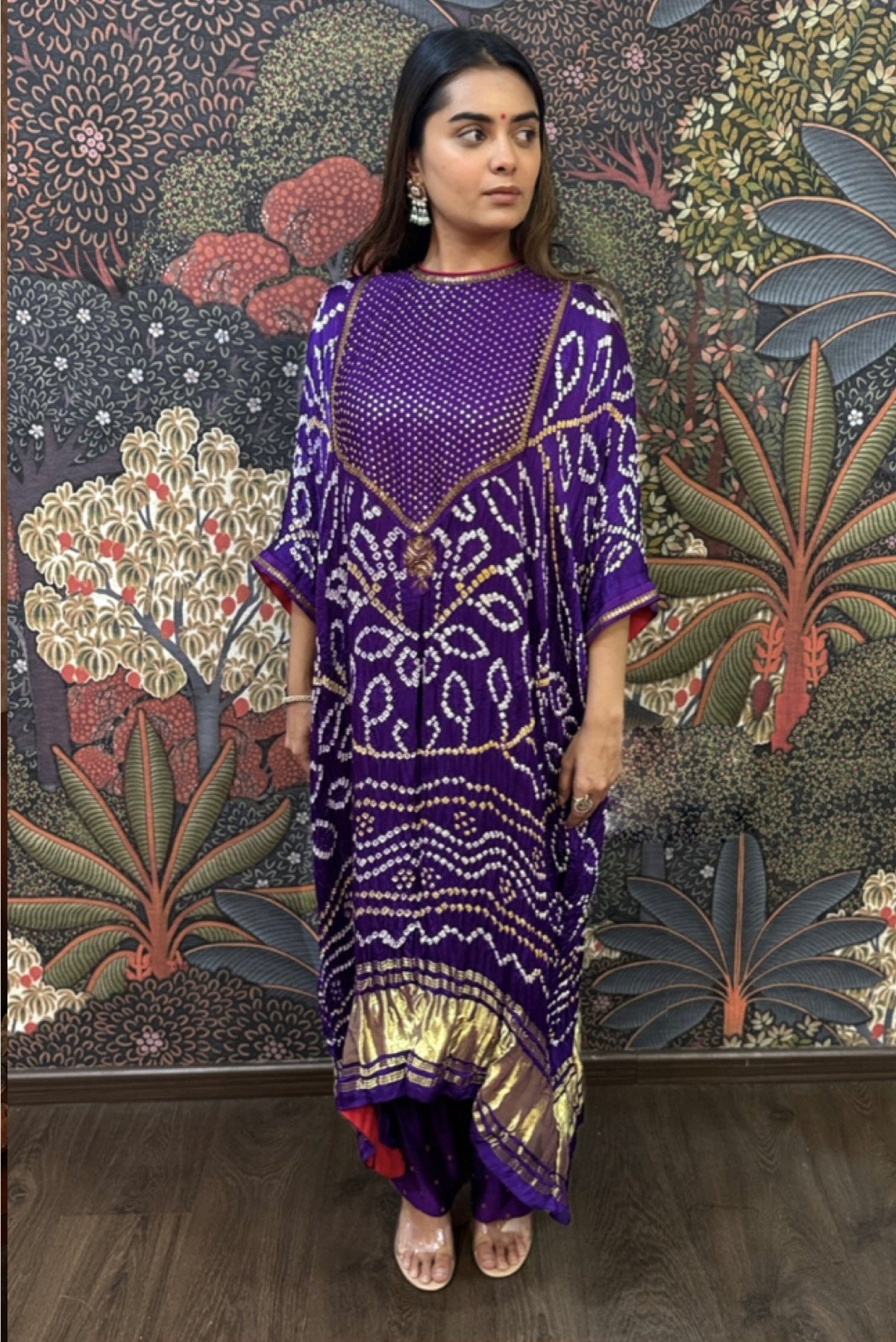 This expertly crafted Purple abha bandhani kaftan features intricate Zardozi work, making it the ideal choice for any festive or pre-wedding occasion.