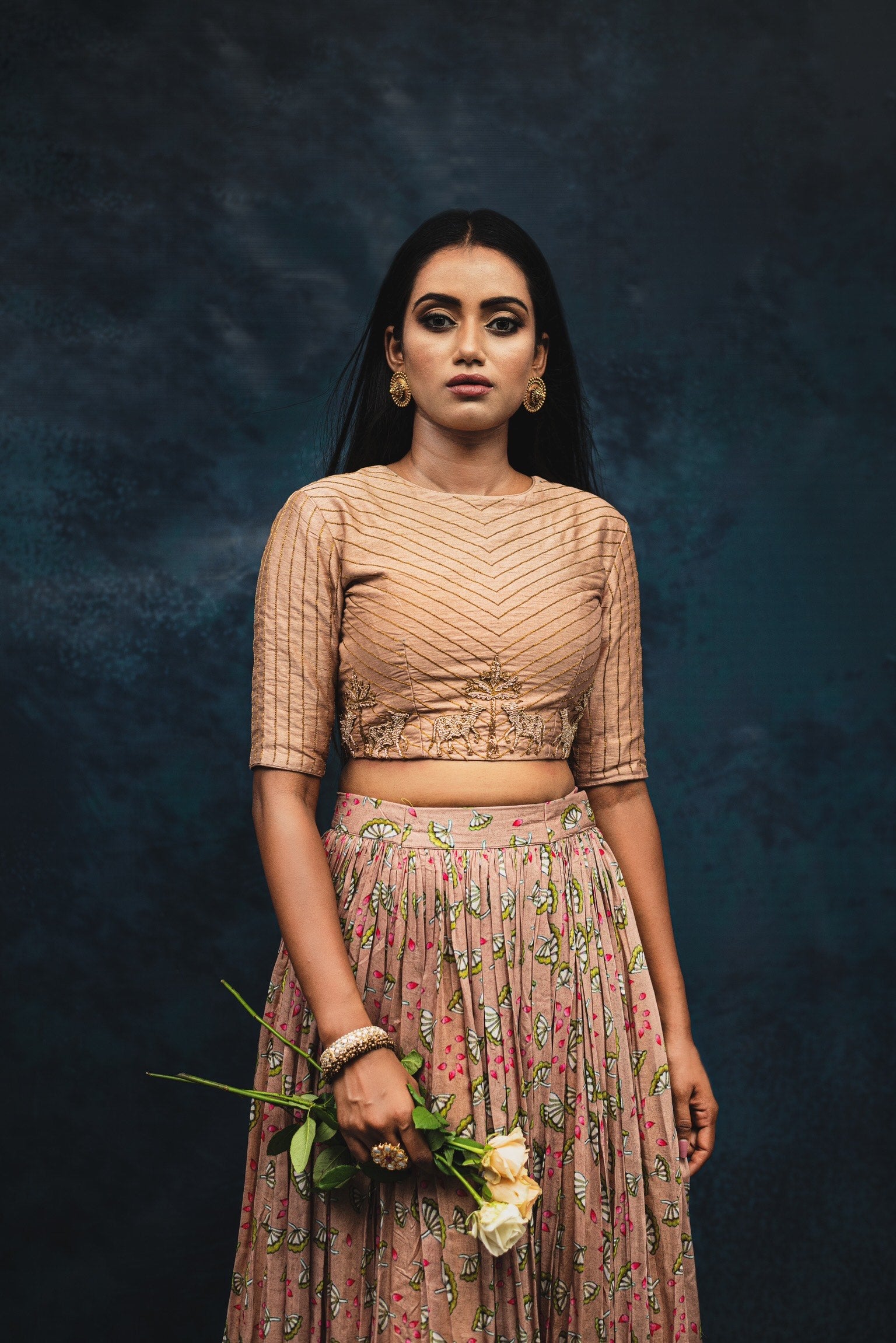 This coffee brown Indo Western Lehenga features a pleated skirt and a crop top with intricate Pichwai-inspired Zardozi work. Fully customisable in any colour or size, it is a perfect option for pre-wedding functions due to its light weight and luxurious embellishments.