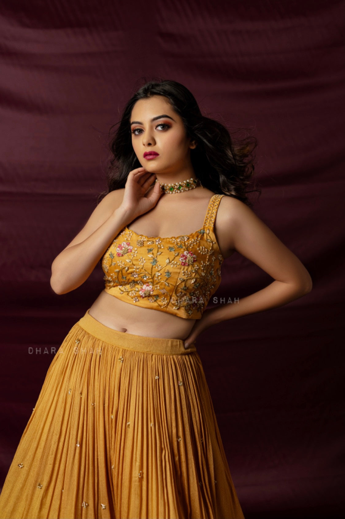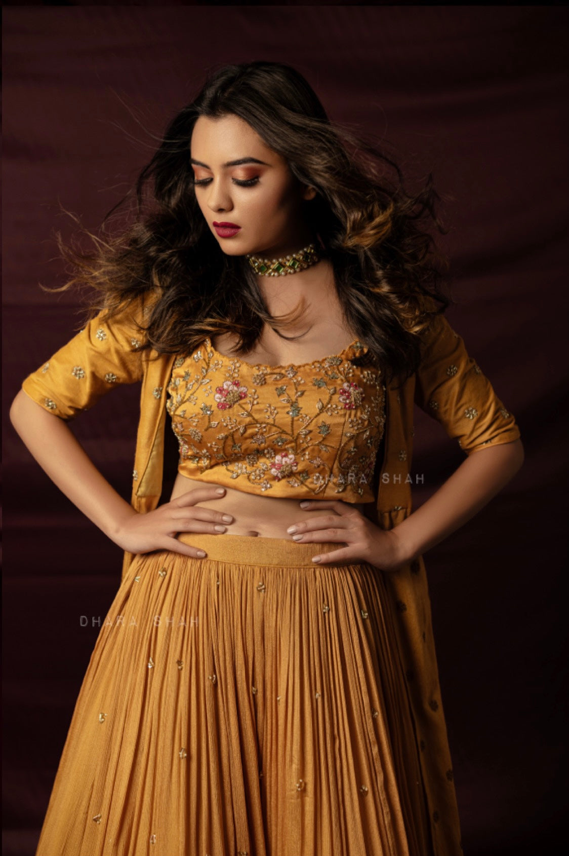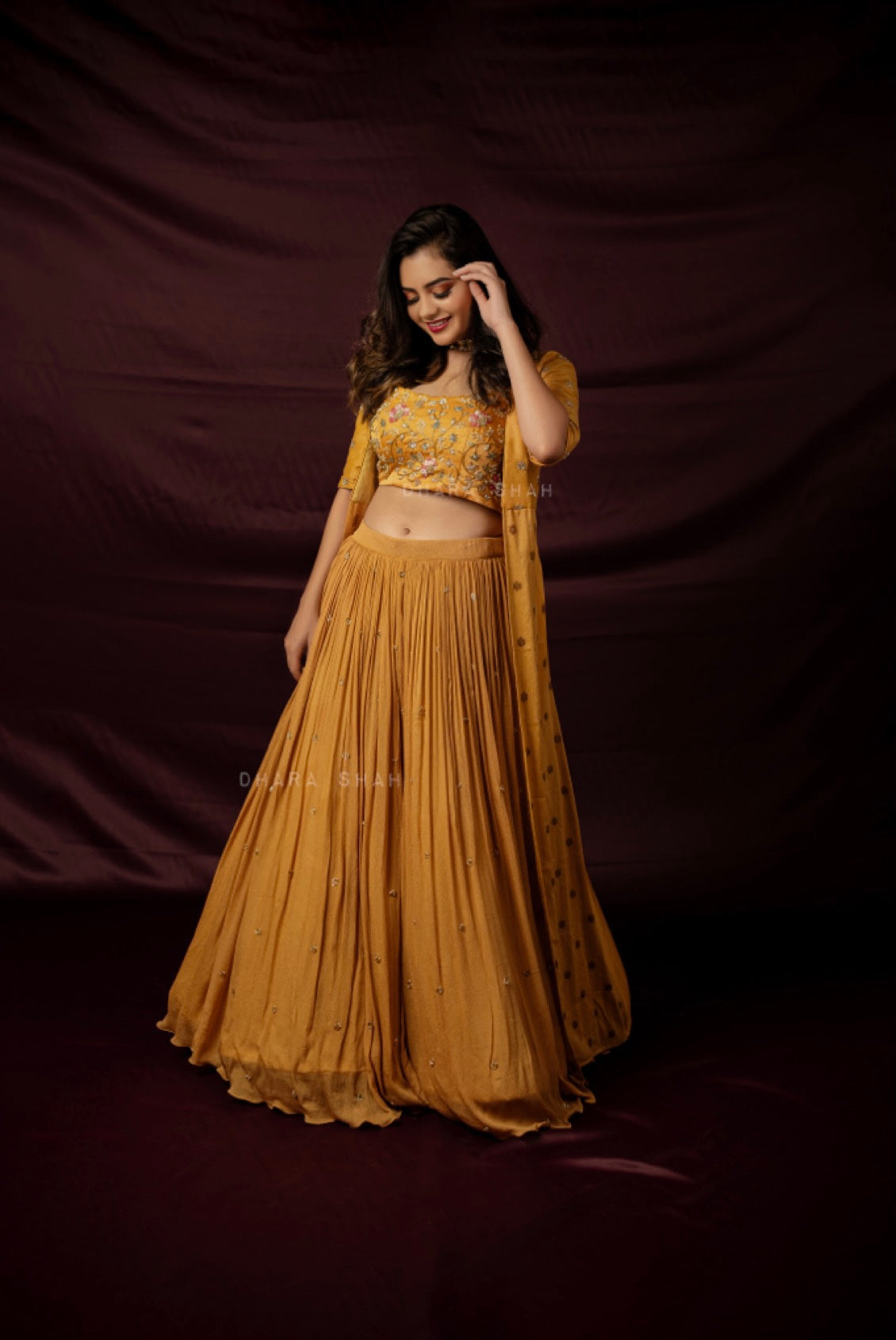 Mustard yellow crop top skirt with cardigan, a perfect Mehndi/ prewedding outfit with intricate Zardozi work.