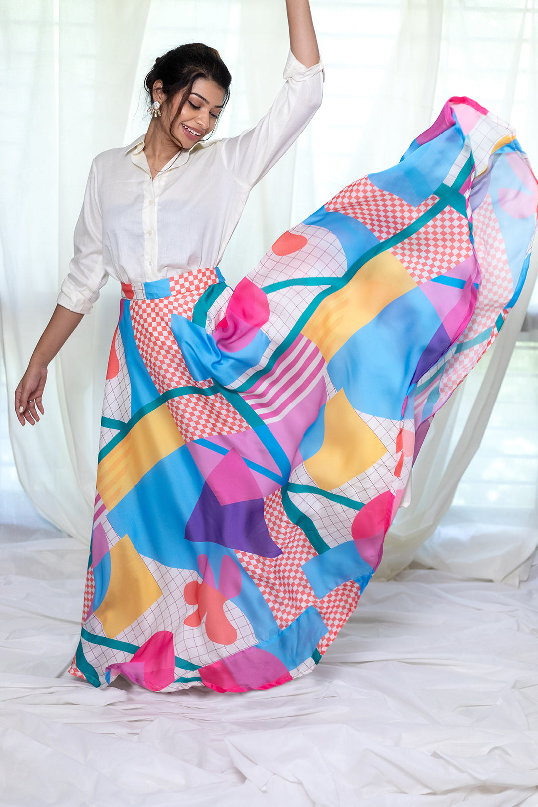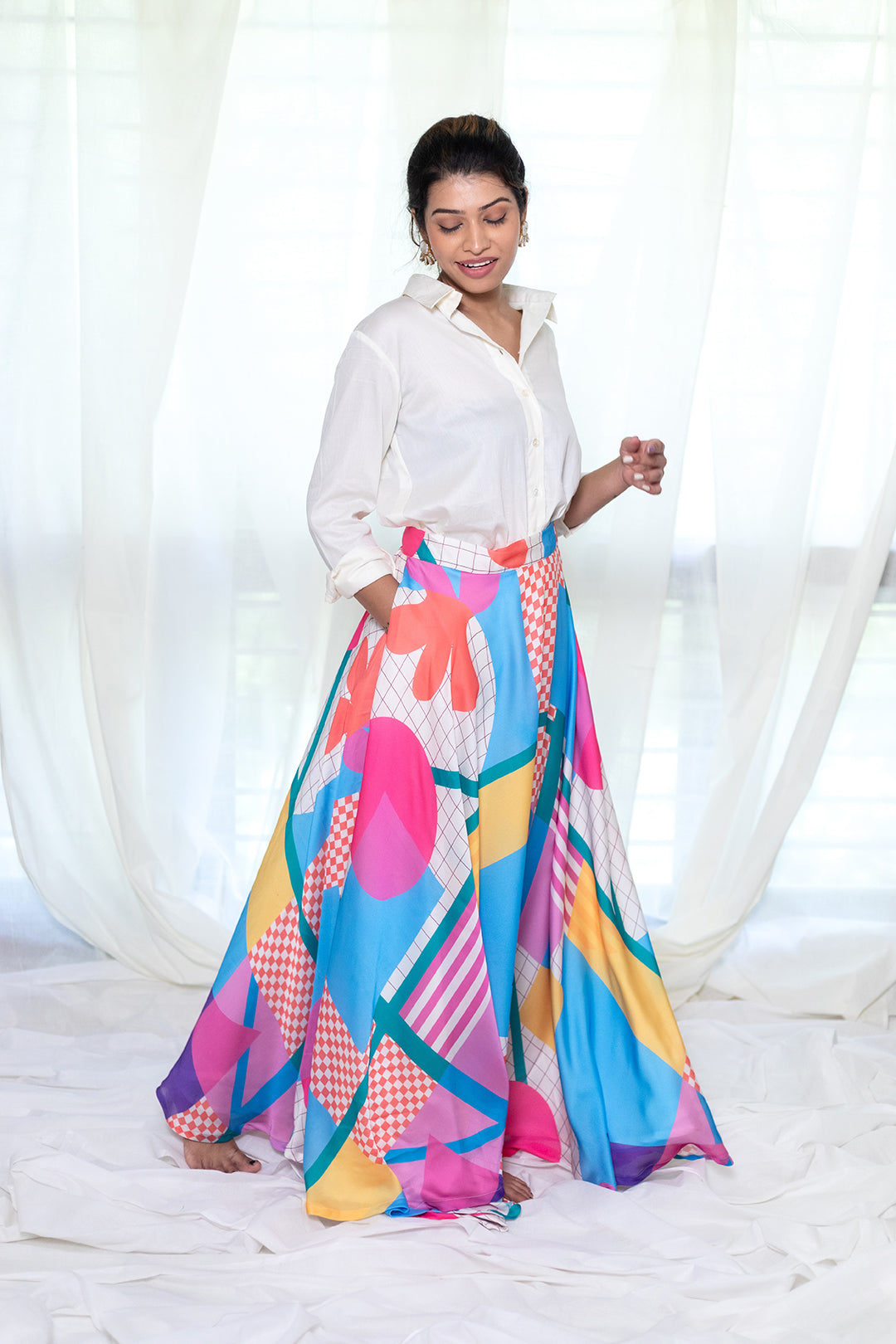 This colorful printed lehenga is perfect for a Mehndi or haldi function for a bride or side bride. You can pair it with a white shirt or crop top and some jewellery and you are sorted. Super comfortable & lightweight, with pocket on one side. Easy to carry for a destination wedding.
