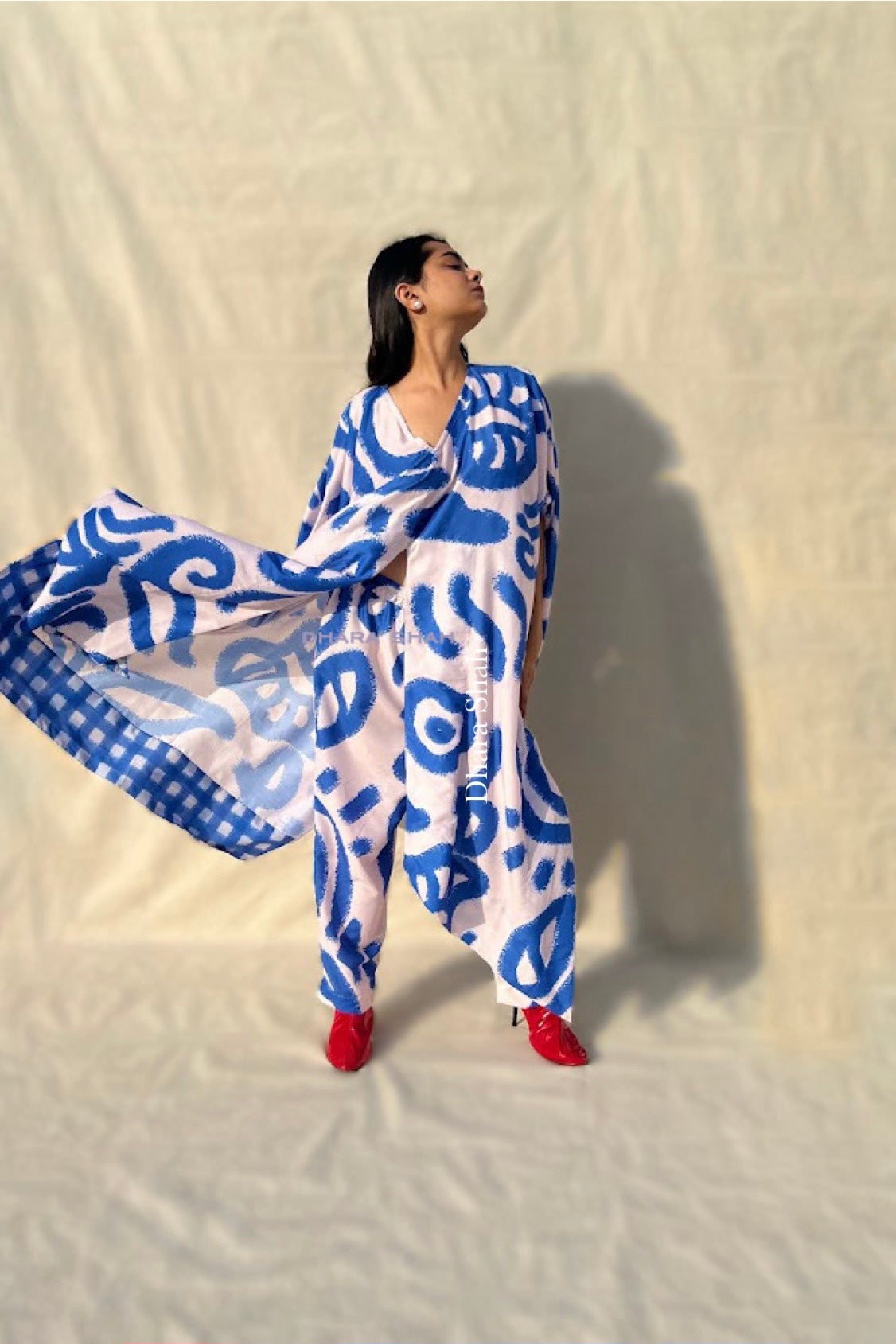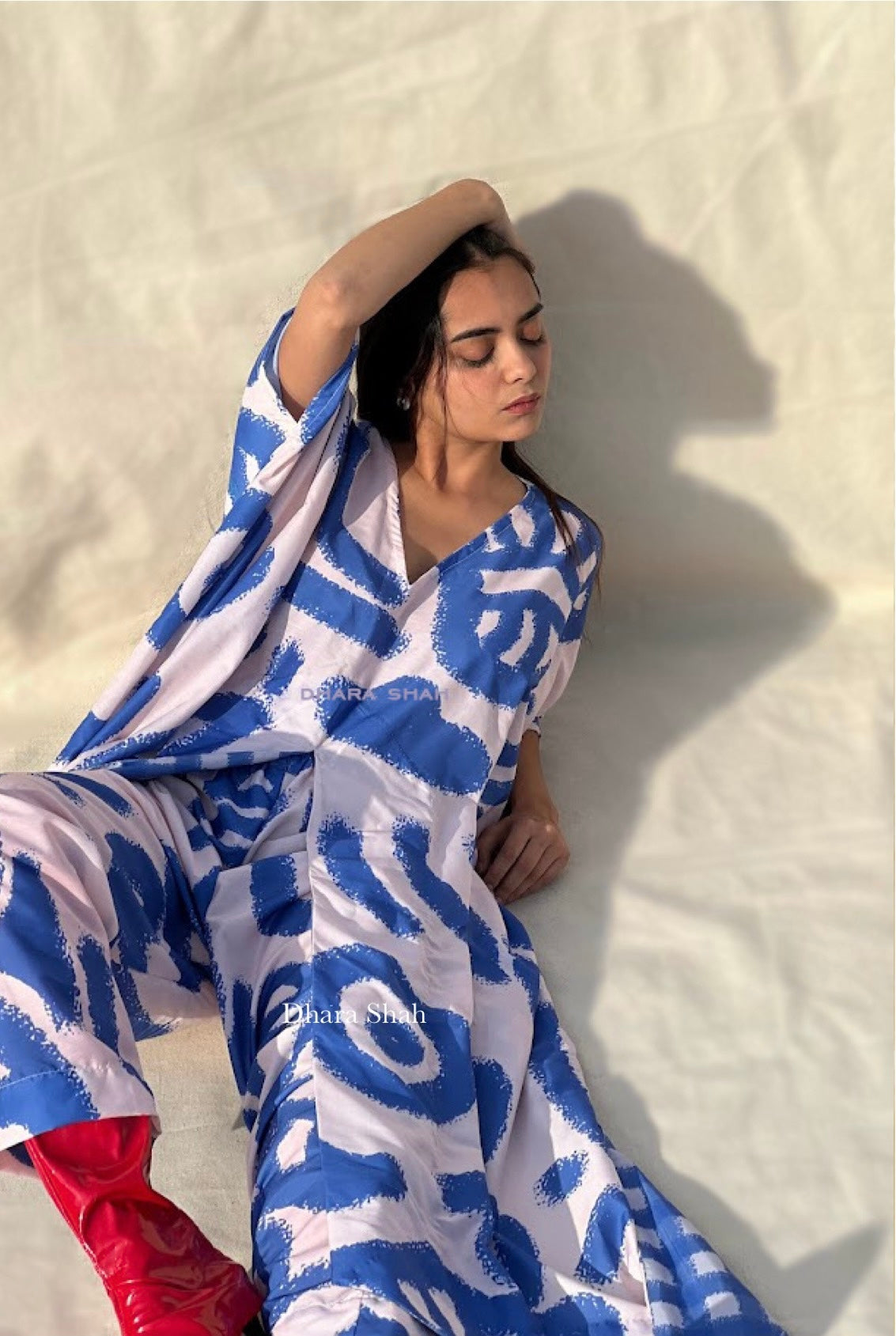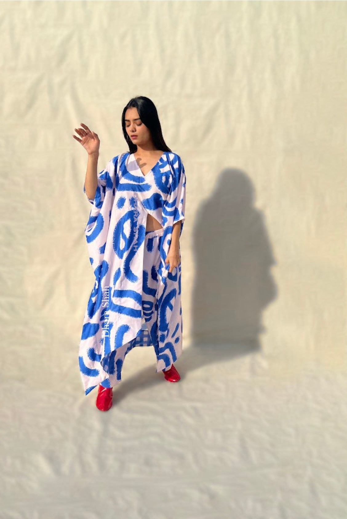 This stylish blue kaftan-style coord set is perfect for any occasion - whether it be a vacation, brunch, or coffee date with friends. Its breezy design and chic print make it a must-have for any wardrobe. Add this lovely piece to your collection for an effortlessly fashionable look.