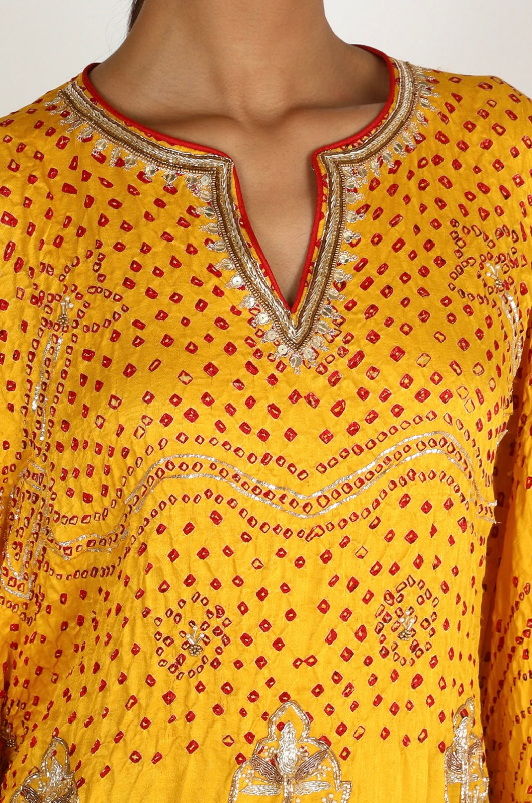 Gaji Silk kaftan with embellished zardozi work in pichwai inspired motif. Lagdi patta at bottom.
