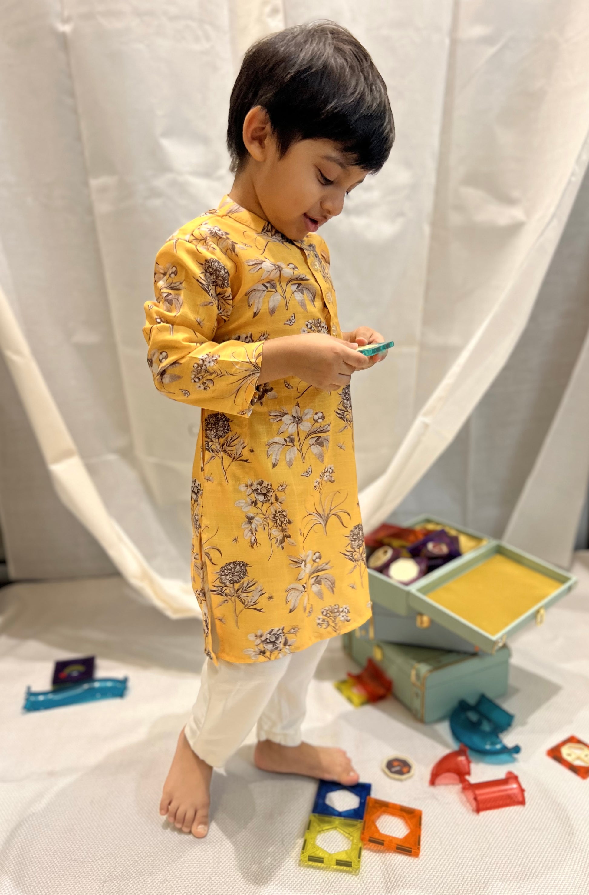 This Yellow Floral Kurta is crafted from premium Cotton Linen and is ideal for any occasion. Its bright yellow hue and floral print are sure to make your little one stand out in style. Featuring a comfortable fit with unique print.
